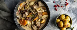 6. Rist hvetemel godt ut i rømme og melk, og hell det over i gryten sammen med rødvin og timian.